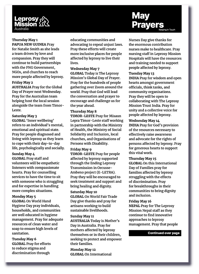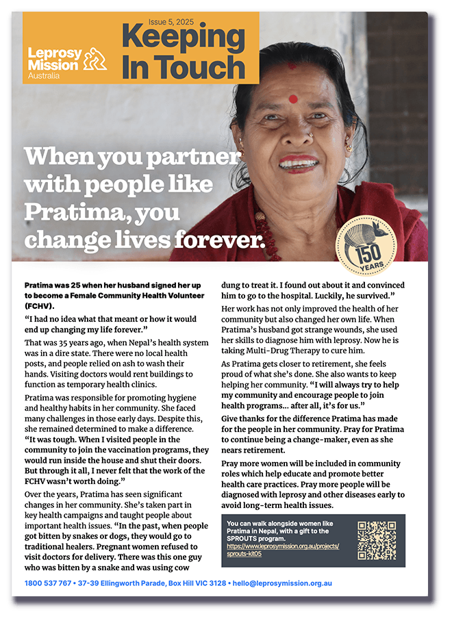We thank you for your support and your prayers. Your support makes the difference as we bring our gratitude and the needs of people affected by leprosy before God.